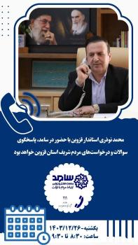 محمد نوذری استاندار قزوین فردا یکشنبه ۲۶ اسفندماه از ساعت: ۰۸:۳۰ تا ۰۹:۳۰ با حضور در مرکز سامد (شماره تماس ۱۱۱) ، با مردم شریف استان گفتگو خواهد کرد.