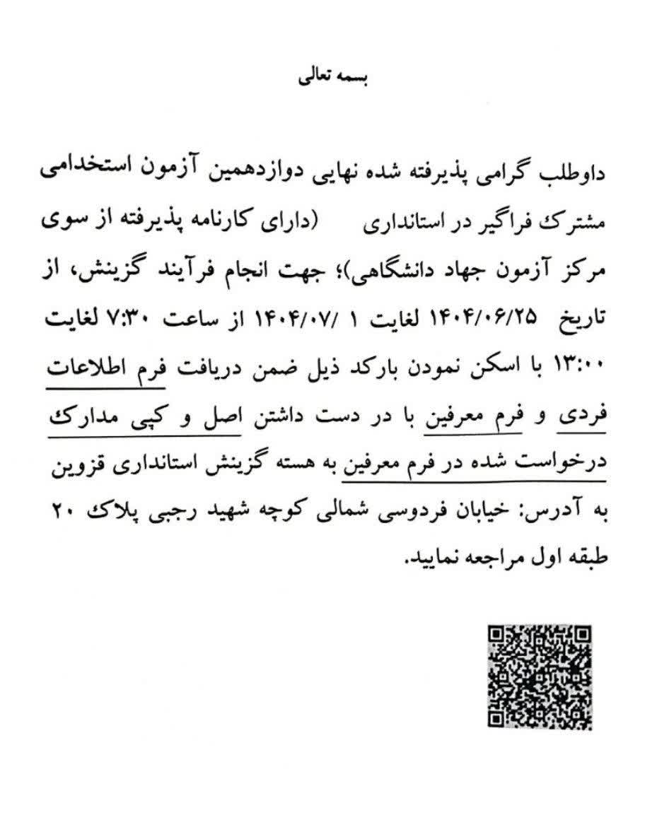 نفیسه حاجسیدجوادی، مدیر هسته گزینش استانداری قزوین با اعلام فراخوان برای پذیرفتهشدگان نهایی دوازدهمین آزمون استخدامی مشترک فراگیر در استانداری گفت: داوطلبان گرامی که کارنامه قبولی خود را از سوی مرکز آزمون جهاد دانشگاهی دریافت کردهاند، لازم است از تاریخ ۲۵ شهریور ۱۴۰۴ لغایت ۱ مهر ۱۴۰۴، در ساعات ۷:۳۰ تا ۱۳:۰۰ با اسکن بارکد اعلامشده و لینک داخل خبر و پس از دریافت فرم اطلاعات فردی و فرم معرفینامهها، با همراه داشتن اصل و کپی مدارک موردنیاز، به هسته گزینش استانداری قزوین مراجعه کنند.